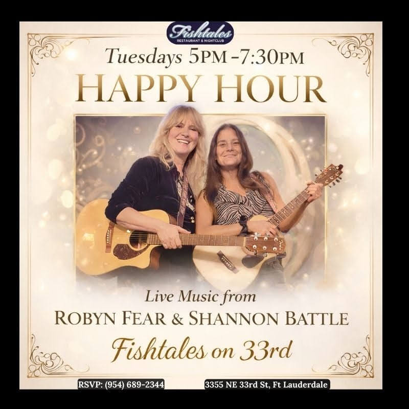 Pictured here with soulful singer, songwriter Shannon Battle. Check her music out on all streaming apps and iTunes. We play duos together (including every Tuesday at Fishtales, Ft Lauderdale) regularly and she's so talented! See Shannon Battle & Robyn Fear Music on Facebook.